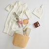 Rai & Co Baby Beanie Apple Knotted (White) - Who doesn't love a gorgeous beanie on a little baby and they are essential to keep those newborn heads snug. Made from matching material to the Apple jumpsuits from Rai & Co. - super stretchy and soft. Made from: 95% Cotton | 5% Spandex. Size: Newborn to 12 weeks.